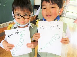 今日は朝顔観察ノートの表紙に飾る≪あさがお≫を折り紙で作りました。