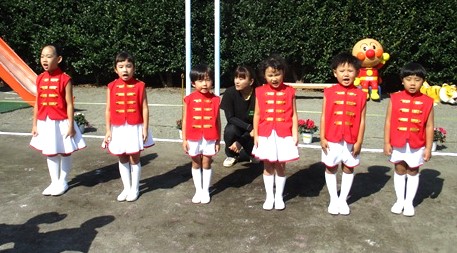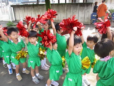 きらきら光る赤とゴールドのポンポンを持って「いろ・いろ・たんけんたい!」を踊りました♪