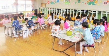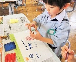 筆を使って みんなで自由に色塗りをしたり、模様を描いたりしました。