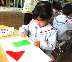 色々な形を見つけながら、画用紙にのり付けして完成したのは・・・。