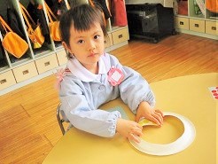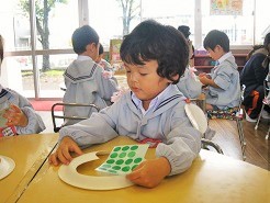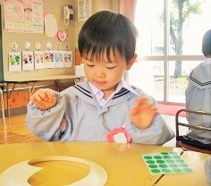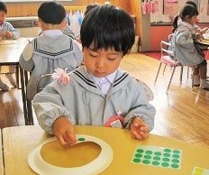 自分の好きな色のシールで紙皿をデコレーションしています!