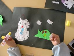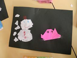 2月の折り紙は ちぎり絵での≪雪だるまとうさぎ≫です。