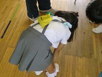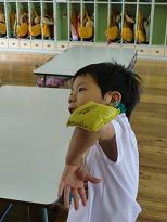 様々な色のbeanbag を 英語を聞いて頭や背中にのせて遊びます。