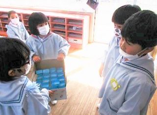 年長つき組さんが、豆まきの箱を地道に作り、