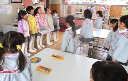 年長つき組さんが、豆まきの箱を作り、