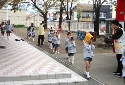 避難訓練の合図後、放送をしっかりと聞いて速やかに戸外へ!