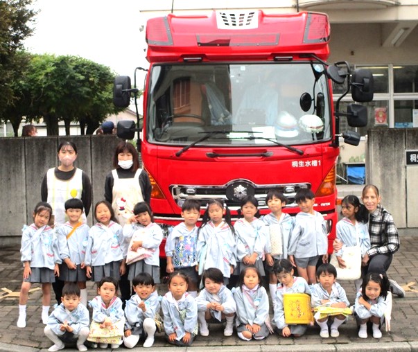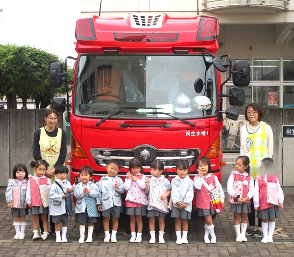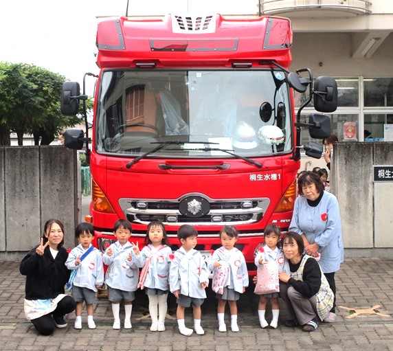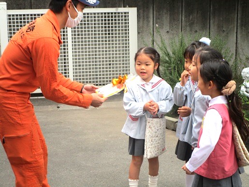 最後に消防隊の方々に年長さんが描いた「いつもありがとう」の