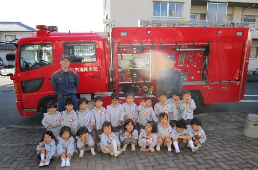 最後に消防隊の方々に年長さんが描いた絵付き金メダルをプレゼントして