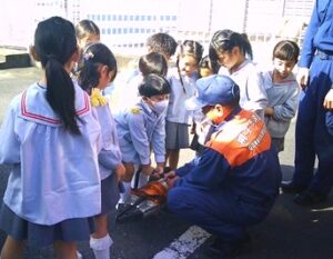 避難訓練の合図後、放送をしっかりと聞いて速やかに戸外へ!