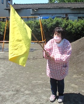 防災ずきんをかぶり、誘導旗を目指して園庭に避難をしました。