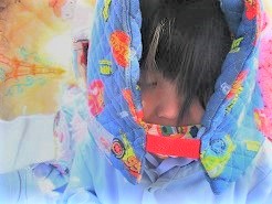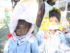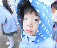 防災頭巾が防寒頭巾に!!・・・・かわいらしい(^^)