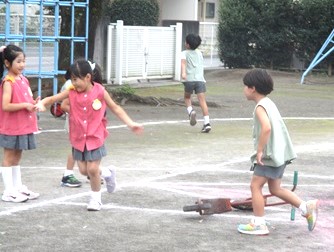 今月は、園庭で遊んでいるときに「職員室からの出火」という設定での避難訓練です。