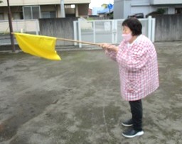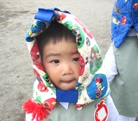防災ずきんをかぶり、誘導旗を目指して園庭に避難をしました。