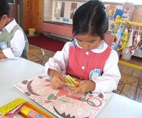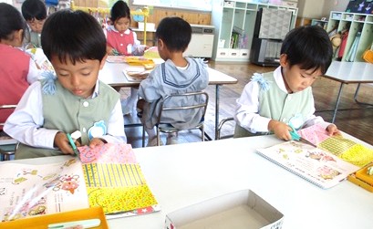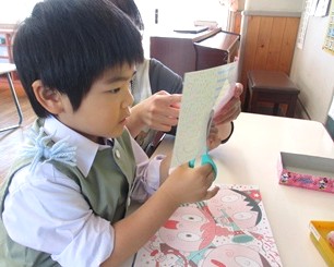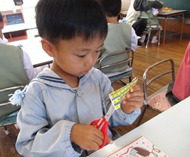 まずは、半分に折った色紙を線に沿って、はさみで切っていきます。