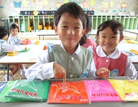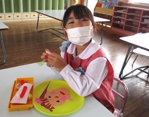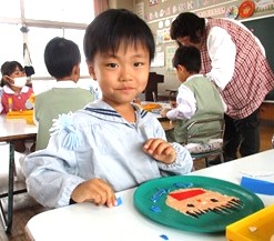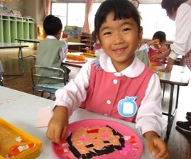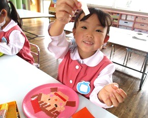 自分の顔をイメージしながらお盆に折り紙をちぎって貼り、形にしていきました。