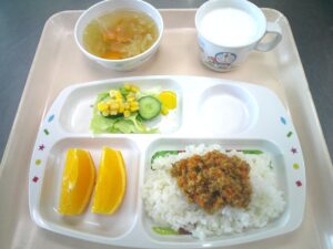 ドライカレー・コンソメスープ・グリーンサラダ・オレンジ・牛乳