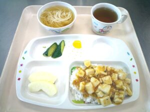 麻婆豆腐丼・そうめんのすまし汁・きゅうりの中華和え・りんご
