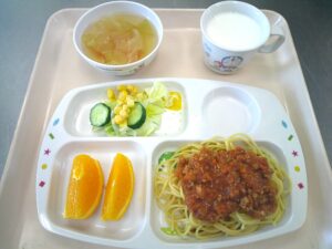 スパゲティミートソース・コンソメスープ・グリーンサラダ・オレンジ・牛乳